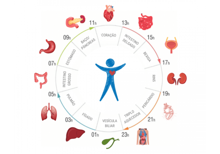 | Fígado | 01:00 – 03:00: O Fígado tem muitas funções importantes, das quais a principal é realizar a desintoxicação do corpo durante estas horas, regenerando-se e processando toxinas acumuladas ao longo do dia. Ou seja, ele limpa o sangue e garante o fluxo suave do qi. Se você acordar durante esse horário, pode ter muita energia yang ou problemas com seu fígado ou vias de desintoxicação. Este também é o horário da raiva, frustração e fúria. | 13:00 – 15:00: O Fígado é conhecido como o general porque acredita-se que ele seja responsável por avaliar situações e conceber planos. Assim, um planejamento rápido e eficiente pode ser mais difícil durante esse período. Além disso, somos mais propensos aos efeitos do estresse, pois a função do fígado de suavizar o qi no corpo é relativamente mais fraca. |
